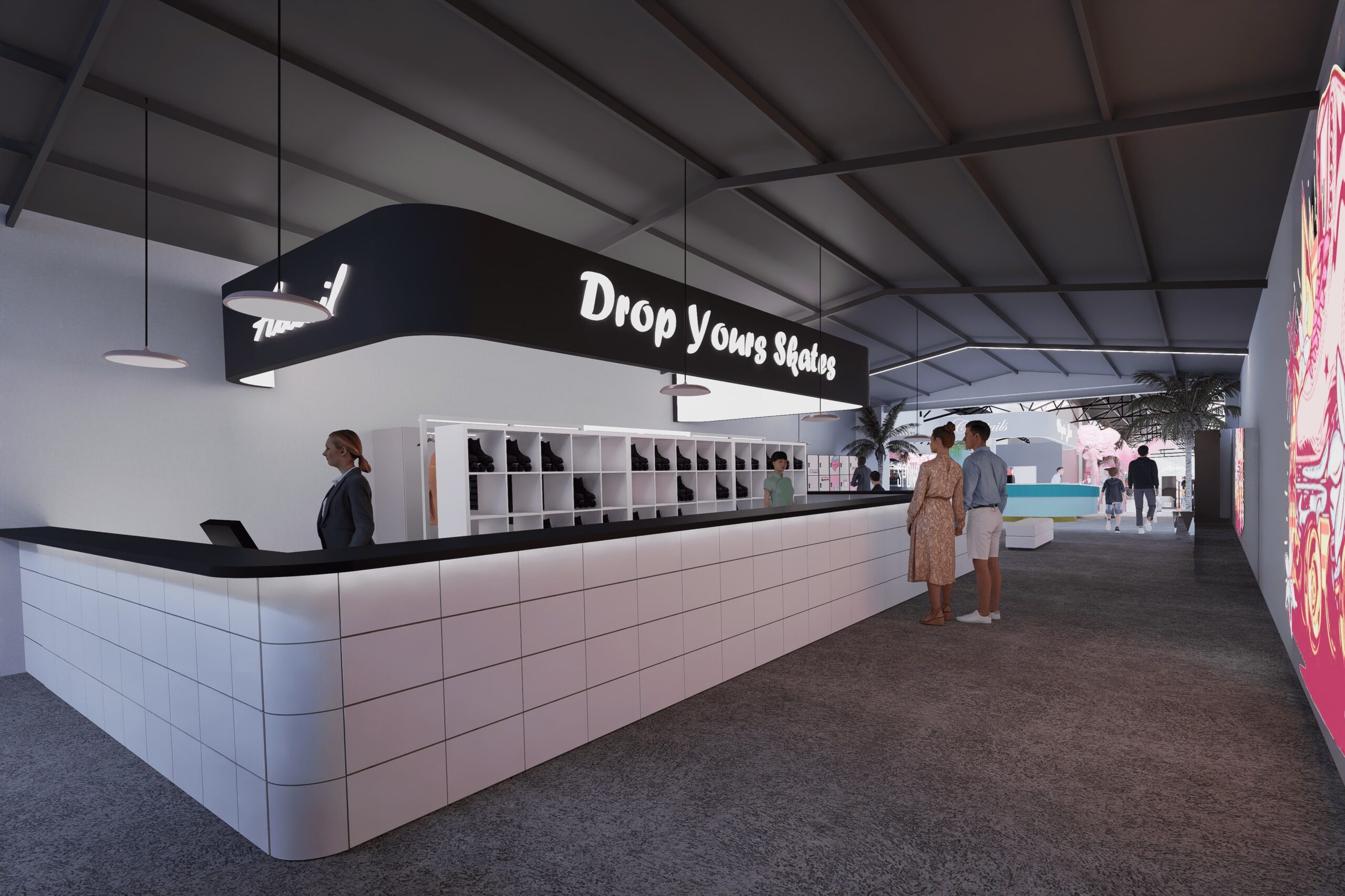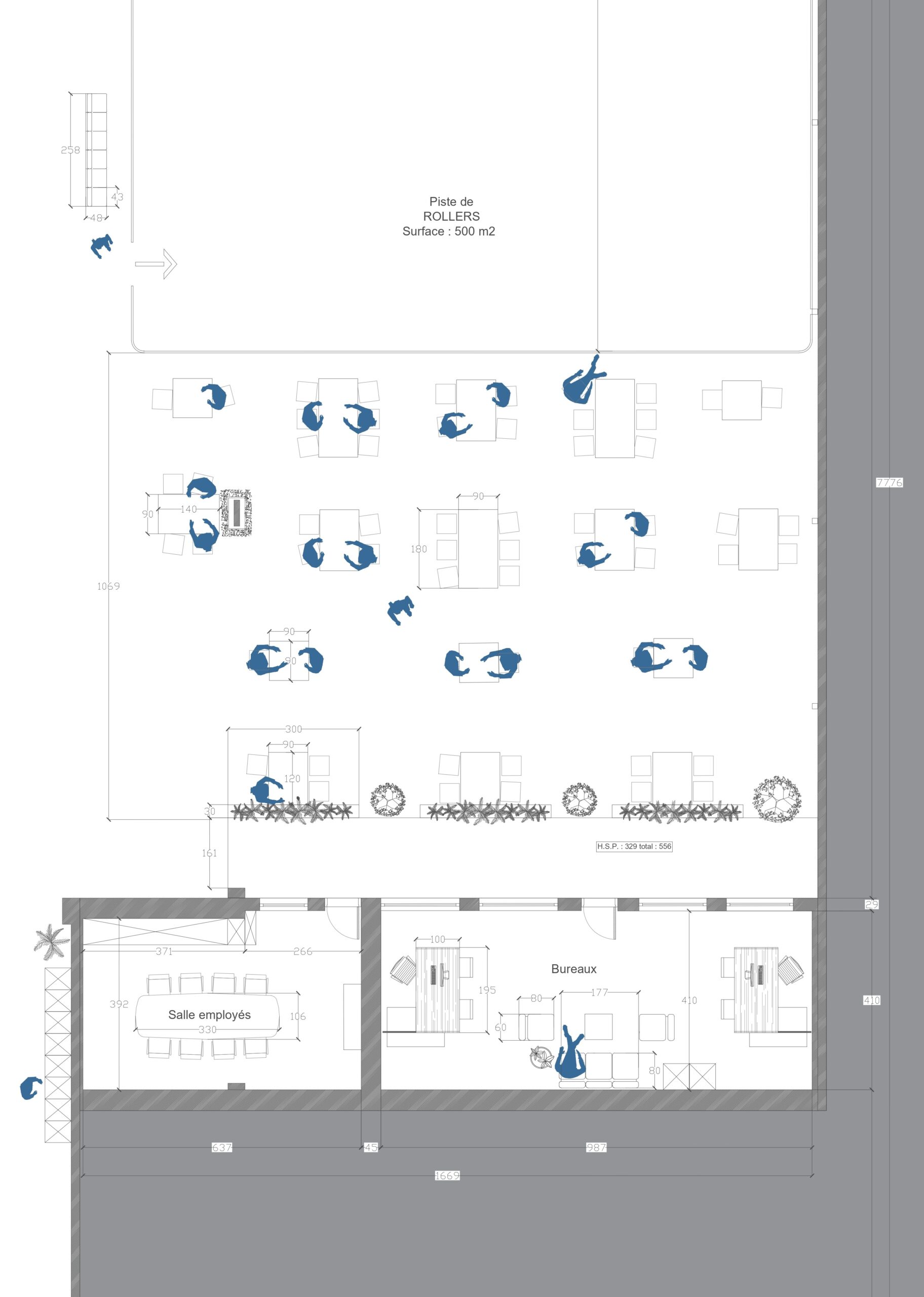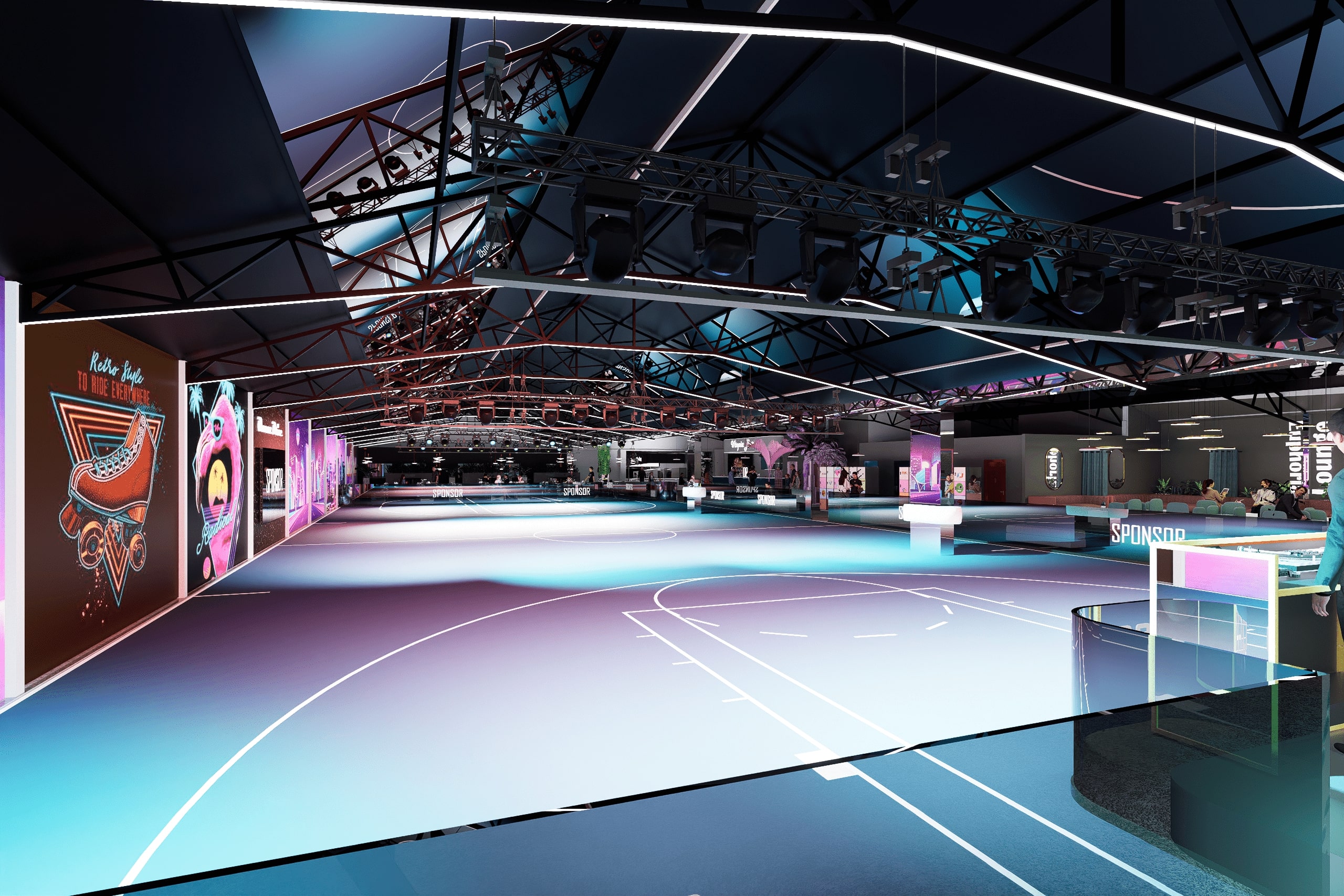 Caractéristiques principales • Accueil chaleureux • Bar branché • Bureaux organisés • Piste de roller spacieuse • Lounge confortable • Restauration variée • Espace enfants sécurisé • Mobilier sur mesure